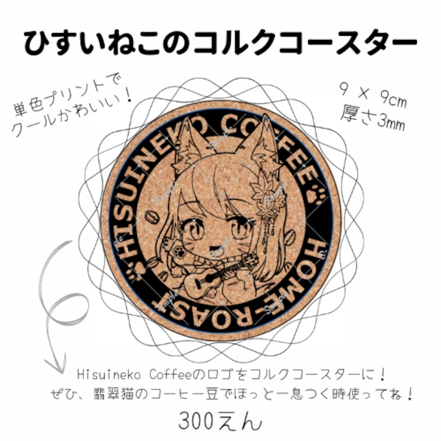 Hisuineko Coffeeのオリジナルコルクコースター! 弾き語りが大好きな翡翠猫がウクレレを持っているよ。