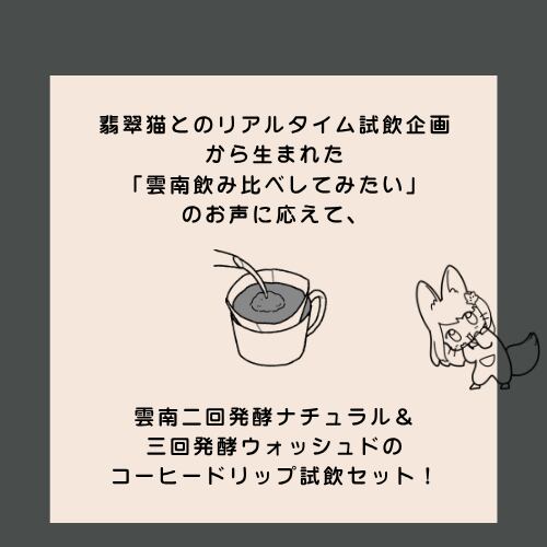 第1回、第2回のライブテイスティング配信で登場した中国雲南の違う地域、違う製法のコーヒーが、どちらもご参加の皆様の注目を集めました!そこで、ぜひその二つを飲み比べしてみたい....!というお声を頂き、今回の特別セットの発売となりました。